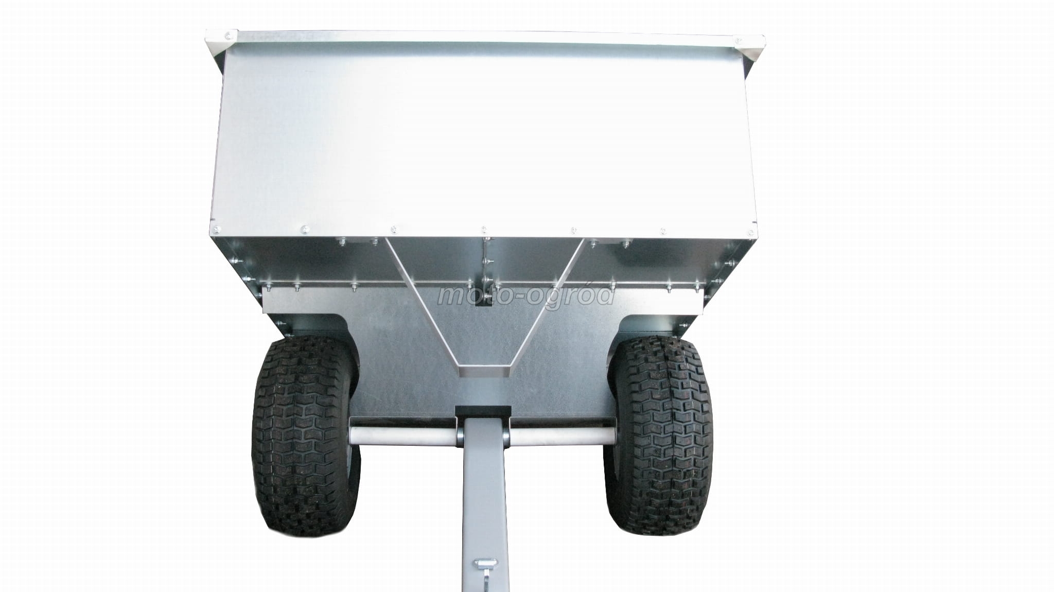 Wykonana z grubej ocynkowanej blachy o grubości 1,0 mm, skrzynia ładunkowa skręcana, dyszel z blachy o grubości 4mm, wszystkie elementy wycinane laserowo. Oś nośna ze specjalnej stali o grubości 25 mm, koła balonowe 15" o wysokiej wytrzymałości, na łożyskach kulkowych.Tylna burta zdejmowana. Zaczep na przetyczkę. Ładowność 250 kg.