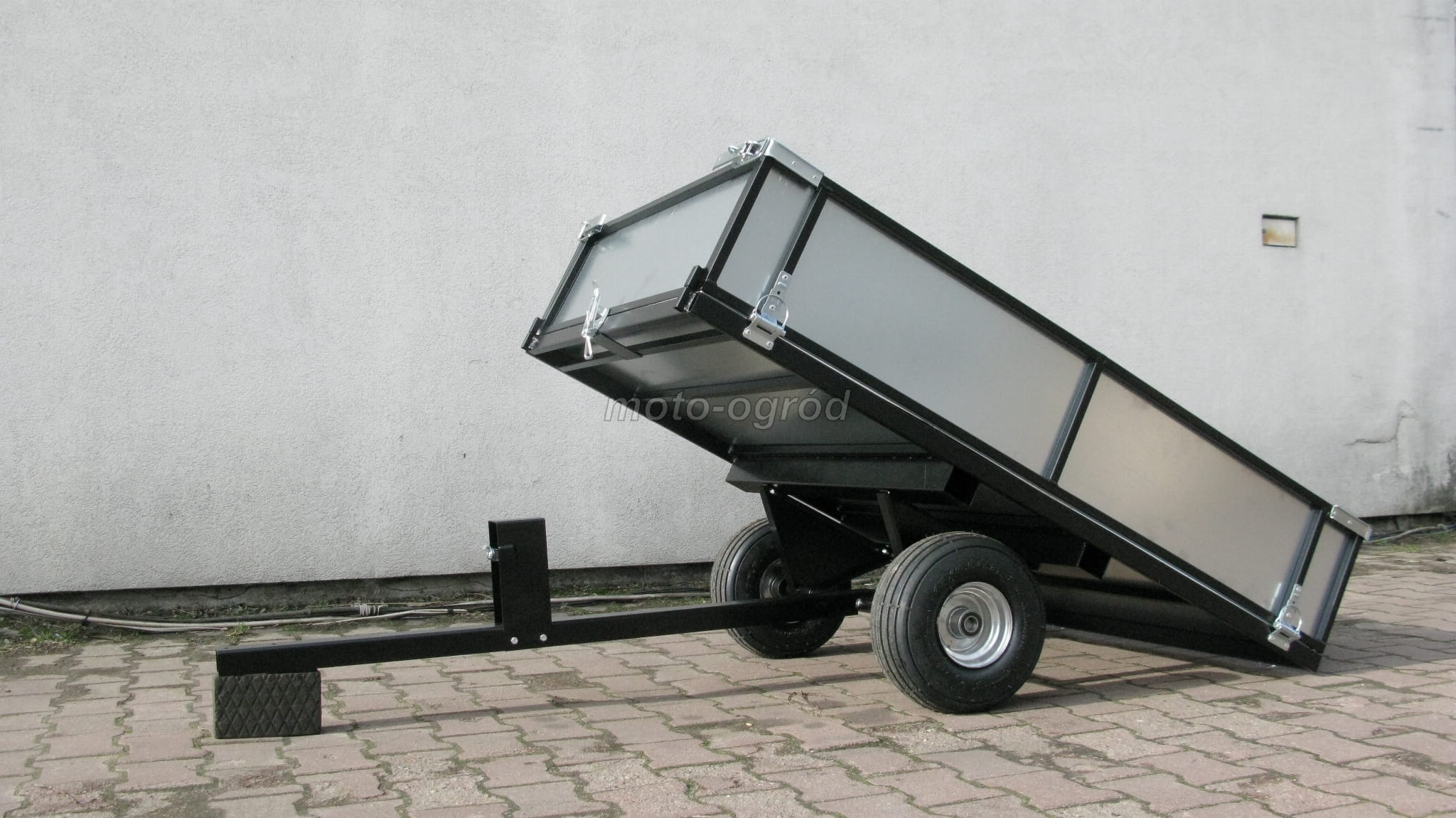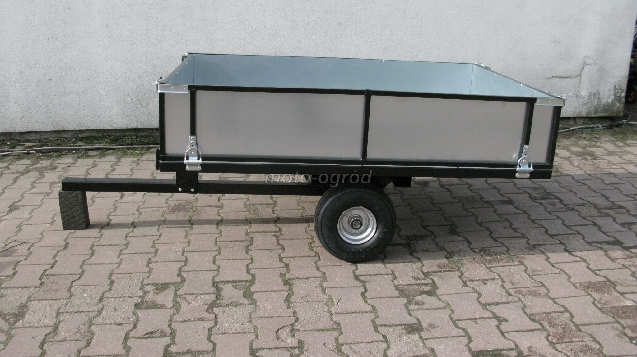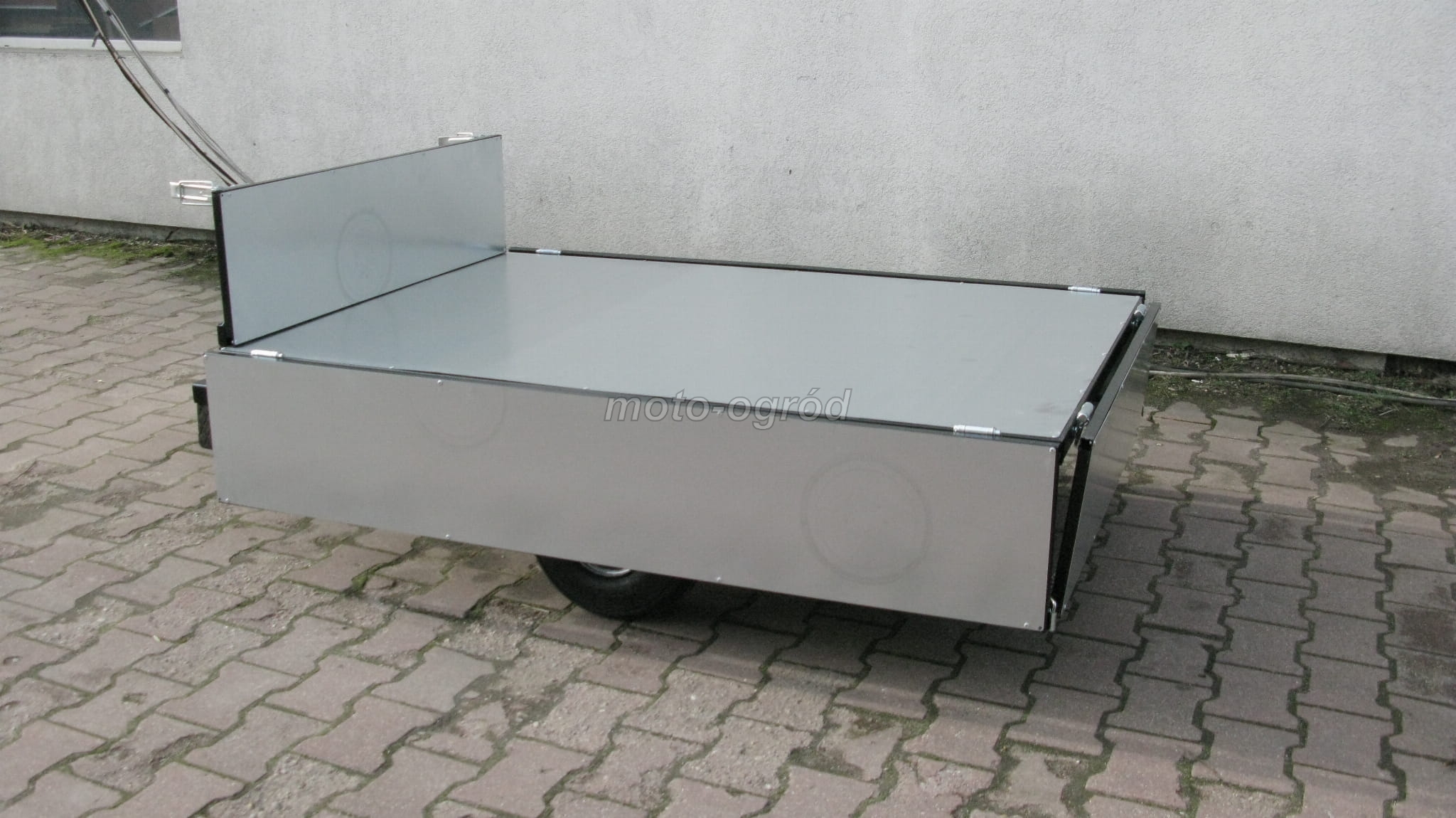 Wykonana blachy o grubości 1,0 mm, skrzynia ładunkowa spawana, wsporniki kół i dyszel z blachy o grubości 4 mm, wszystkie elementy malowane proszkowo. Oś nośna przestawna ze specjalnej stali o grubości 25 mm, koła balonowe 15" o wysokiej wytrzymałości, na łożyskach kulkowych. Wszystkie burty zdejmowane. Ładowność 600 kg. Możliwość zastosowania nadstawek - opcja.